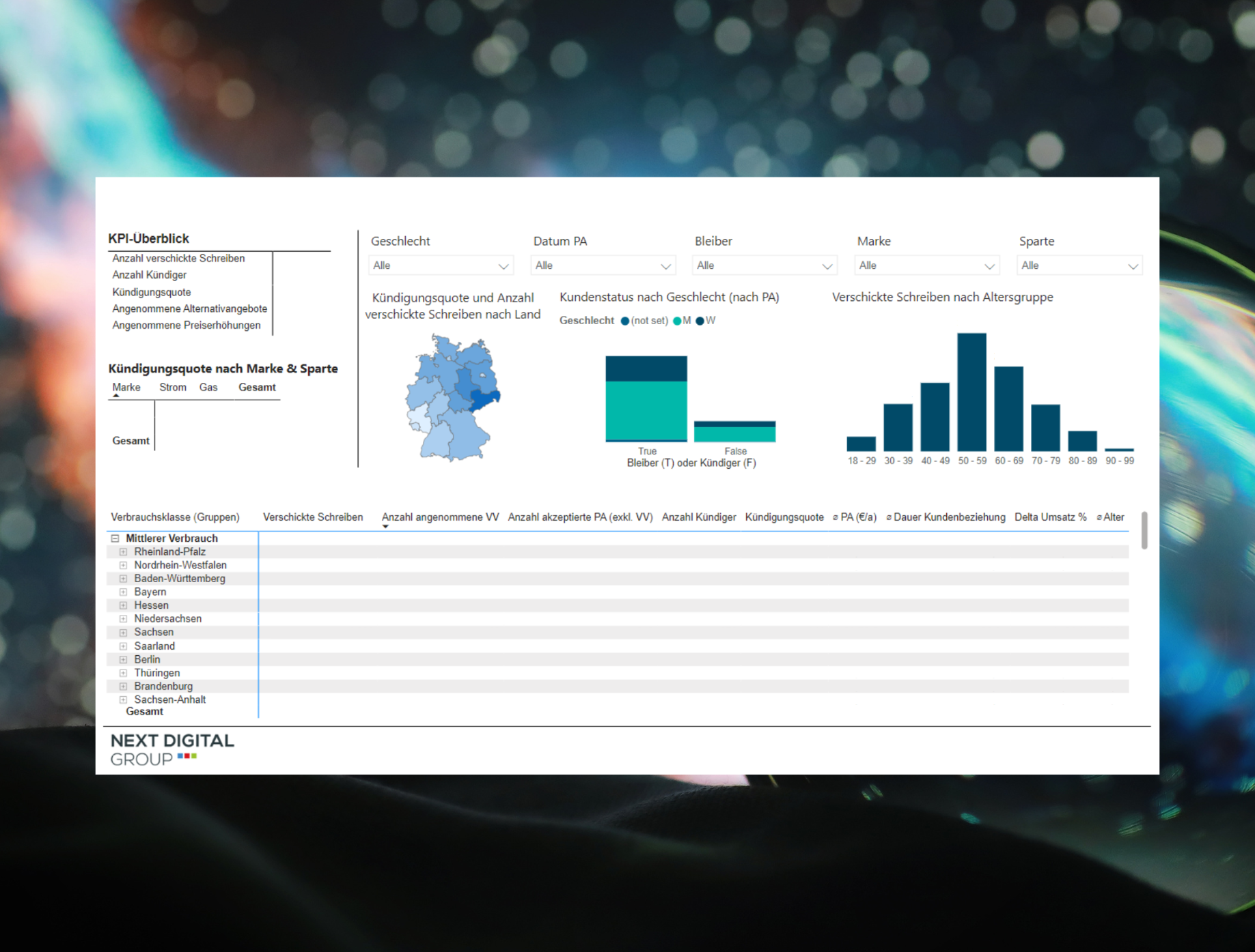 Um die Kundenabwanderungen nach Preisanpassungen zu analysieren und die Beweggründe der abwandernden Kunden zu verstehen, haben wir mithilfe eines Machine-Learning-Algorithmus ein Prognosemodell entwickelt. Als Datengrundlage für unser Prognosemodell verknüpfen wir kundenspezifische Daten (u. a. Demografie, Transaktionen, Nutzungsdaten und Zufriedenheit) mit Marktforschungsdaten (u. a. Preisanalyse, Meinungsforschung, Marktsegmentierung und Trendanalyse) und erhalten somit eine aussagekräftige Basis für unseren Algorithmus. Mithilfe von historischen Kunden- und Abwanderungsdaten trainieren wir unser entwickeltes Prognosemodell und können somit die Einflussfaktoren der Kündigungen analysieren. Die identifizierten Einflussfaktoren nutzen wir, um Prognosen über das zukünftige Kunden- und Abwanderungsverhalten bei verschiedenen Preisanpassungsszenarien zu treffen und Kündigungswahrscheinlichkeiten zu berechnen.