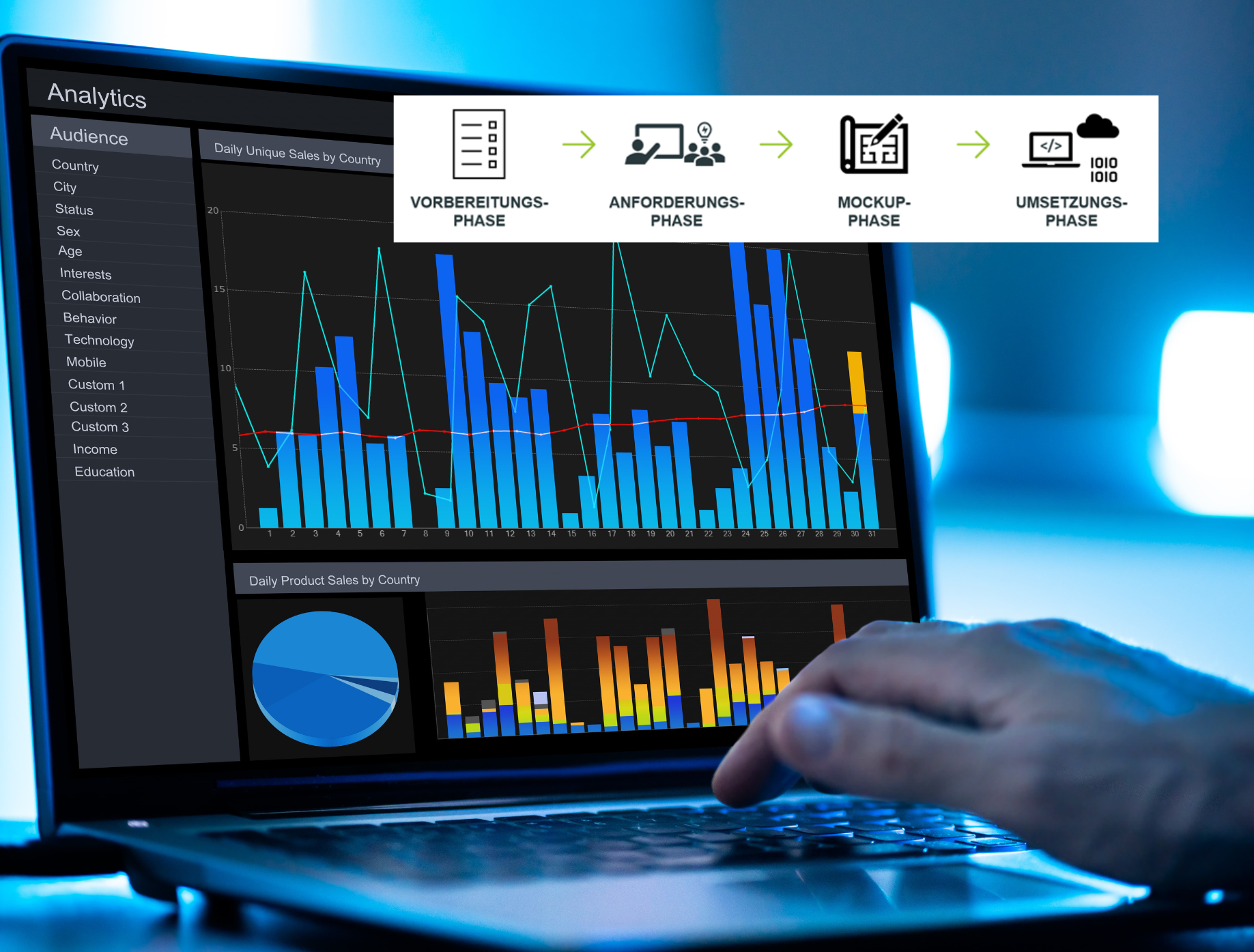 In dieser Phase konzipieren wir auf der Grundlage der validierten Anforderungen der Kunden ein initiales Mockup des Reportings. Je nach den individuellen Präferenzen der Kunden und der erforderlichen Komplexität des angestrebten Ergebnisses erstellen wir ein Design-Mockup zur Veranschaulichung der Visualisierung oder ein funktionales Mockup (Klick-Dummy), in dem neben der Visualisierung auch die Funktionalitäten des Reportings getestet werden können. In beiden Fällen führen wir zur Finalisierung des Mockups iterative Feedbackschleifen mit unseren Kunden durch.